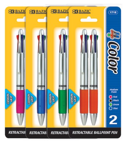 Good but breaks easily, October 18, 2010 Amazon Verified Purchase This review is from: BAZIC Silver Top 4-Color Pen with Cushion Grip, Assorted, 2 Per Pack (Office Product) Basically, I like the pen and it writes smooth. But I bought three and two of them already got broken open on the surface. In addition, the green color doesn't write that well as other three colors.