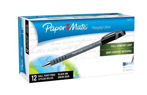 This is my workhorse pen., December 27, 2002 By Walter Reade (Appleton, WI United States) - See all my reviews This review is from: Paper Mate Flexgrip Ultra Stick Fine Point Ballpoint Pens, 12 Black Ink Pens (9680131) (Office Product) I use this pen nearly exclusively for the following reasons: (1) The base provides a comfortable gripping surface, (2) the cap stays on tight, (3) it is reliable, (4) it rarely makes ink globs.
